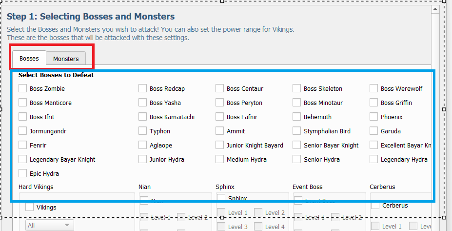 Chọn các loại boss hoặc quái vật mà bạn muốn đánh bằng preset này.
