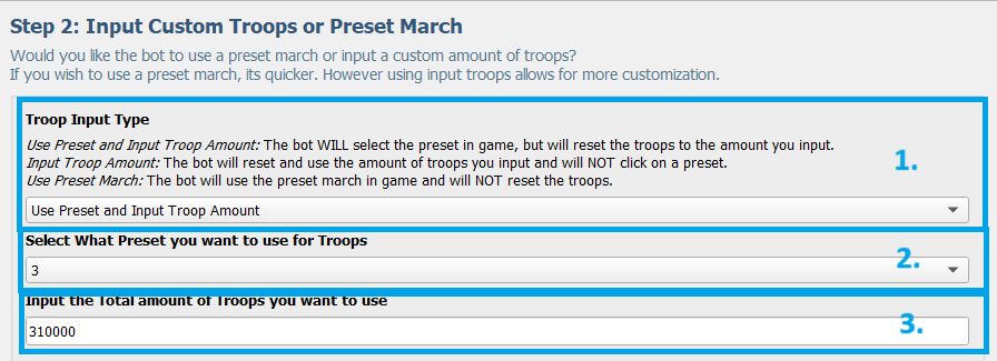 Input Total Troop Amount: Nhập tổng số lượng lính bạn muốn mang đi. Bot sẽ nhập số này cho đời lính (tier) đầu tiên nó tìm thấy theo cài đặt của bạn.