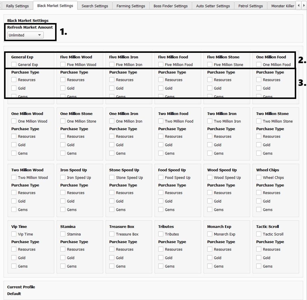 • Bạn cần vào tab Black Market Settings để thiết lập các vật phẩm muốn mua.