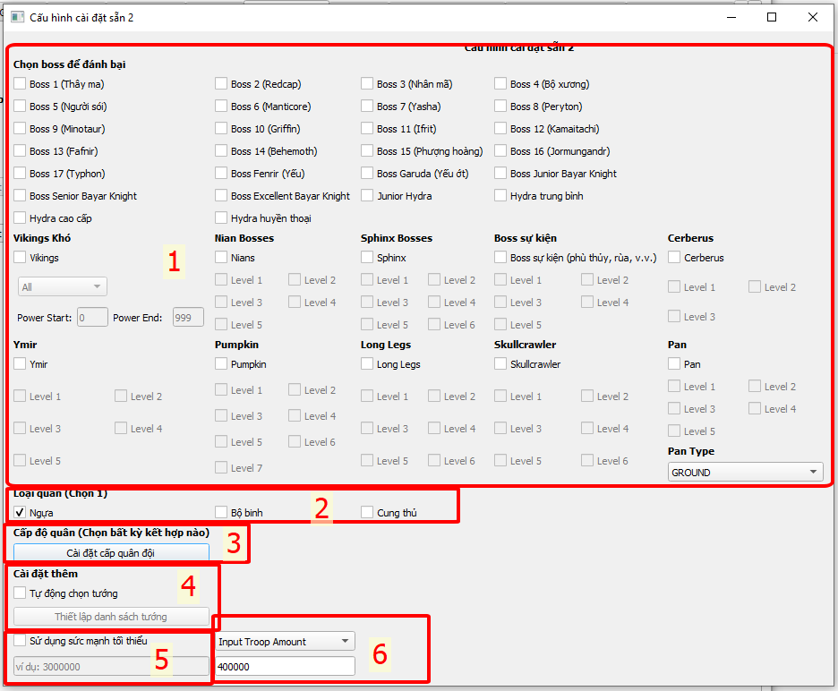 3. Chọn cấp quân: Bạn có thể chọn một số cấp quân mà bạn muốn sử dụng để đánh bại một số trùm.