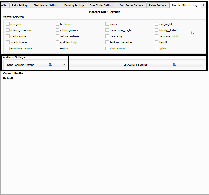 • Tại đây, bạn tích chọn các loại quái vật cụ thể mà bạn muốn bot đi đánh.