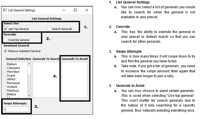 • Tính năng này sẽ ưu tiên sử dụng tướng đứng đầu trong danh sách, hoặc cố gắng tìm các tướng trong danh sách bạn đã chọn (trong phần cài đặt tham gia rally).