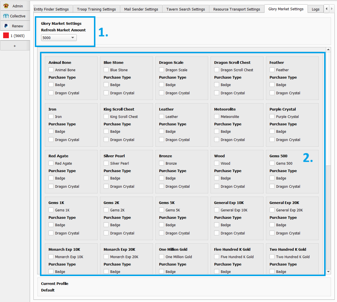 • Bạn có thể mở sẵn menu Glory Market trong game, hoặc cứ để ở màn hình chính và bot sẽ tự tìm cách mở nó.