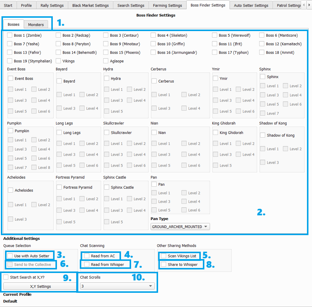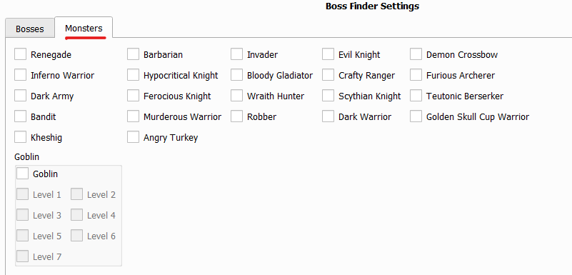 • Vào tab Boss Finder Settings. Tại đây bạn sẽ chọn danh sách boss muốn tìm.