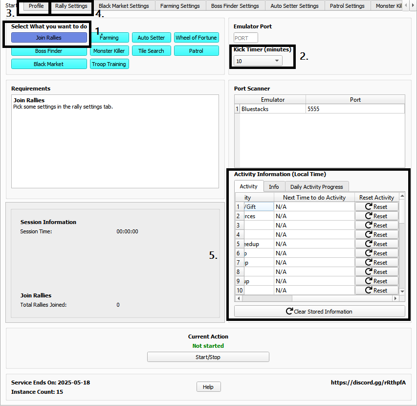Rally Iterations (Số lần lặp lại tìm Rally): Đây là số lần lặp mà bot dành ra để tìm kiếm các rally có thể tham gia trong menu rally.