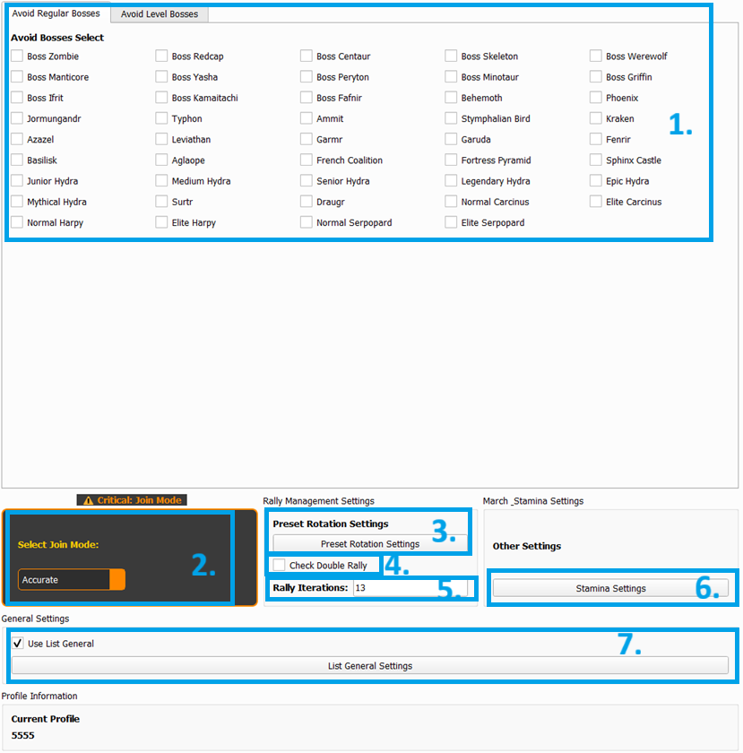 • Fast: Một phiên bản tối giản hóa. Nó sẽ không quan tâm đến thời gian đếm ngược nhưng vẫn tuân thủ danh sách boss cần tránh. Tuy nhiên, nó chỉ tham gia rally boss quái vật và sẽ không tham gia rally PvP. Tất cả các cài đặt rally khác vẫn được áp dụng.