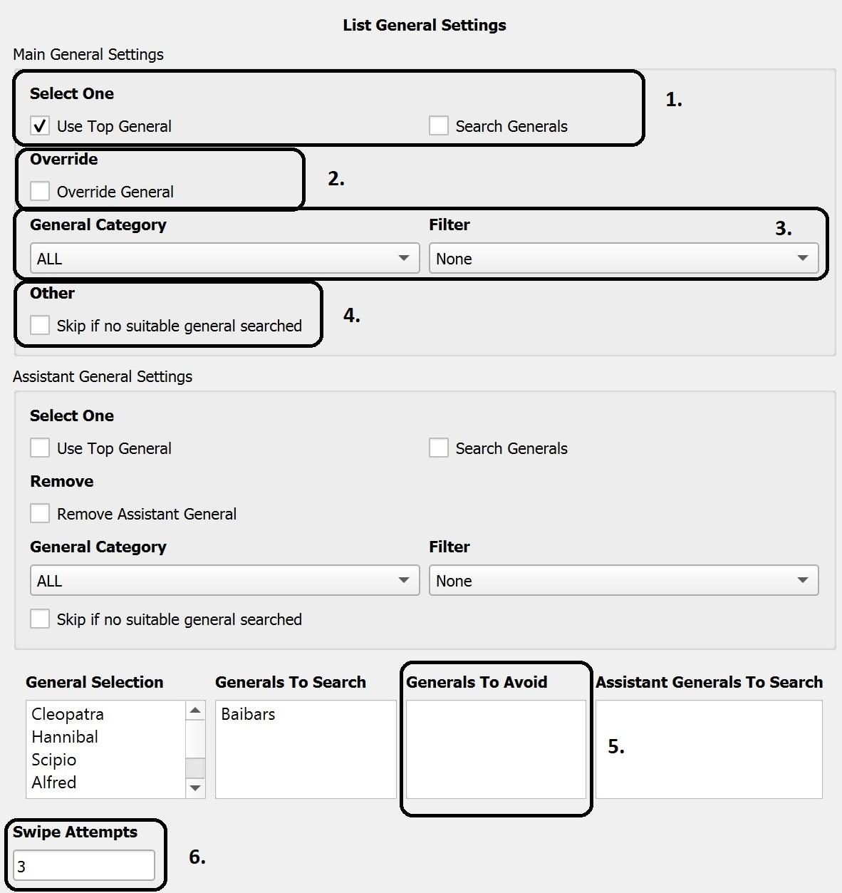 Generals to Avoid (Tướng cần tránh): Bạn có thể chọn tránh sử dụng một số tướng nhất định. Tính năng này được dùng khi chọn "Use top general" (Dùng tướng đứng đầu). Nó sẽ không ảnh hưởng đến việc tìm kiếm tướng cụ thể vì khi đó bot chỉ tìm đúng tướng đó và tự động bỏ qua các tướng khác.